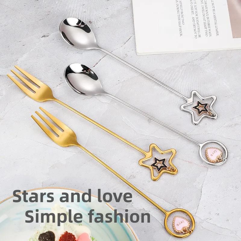 1 Stück Edelstahl Kaffeelöffel Langer Griff Rührgabel Herz Stern Anhänger Rührlöffel Obstgabel Küchengeschirr