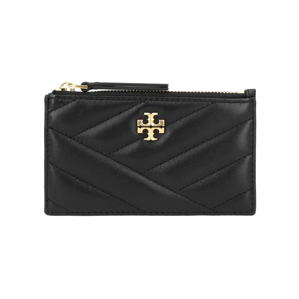The Tory Burch Kira Chevron Quilted Zip Card Wallet 156556 001 is crafted from high-quality calf leather, featuring a sophisticated black color. This wallet combines function and style with four card slots and one zip compartment for secure storage. The chic chevron quilting adds a modern touch, making it a practical yet fashionable accessory.