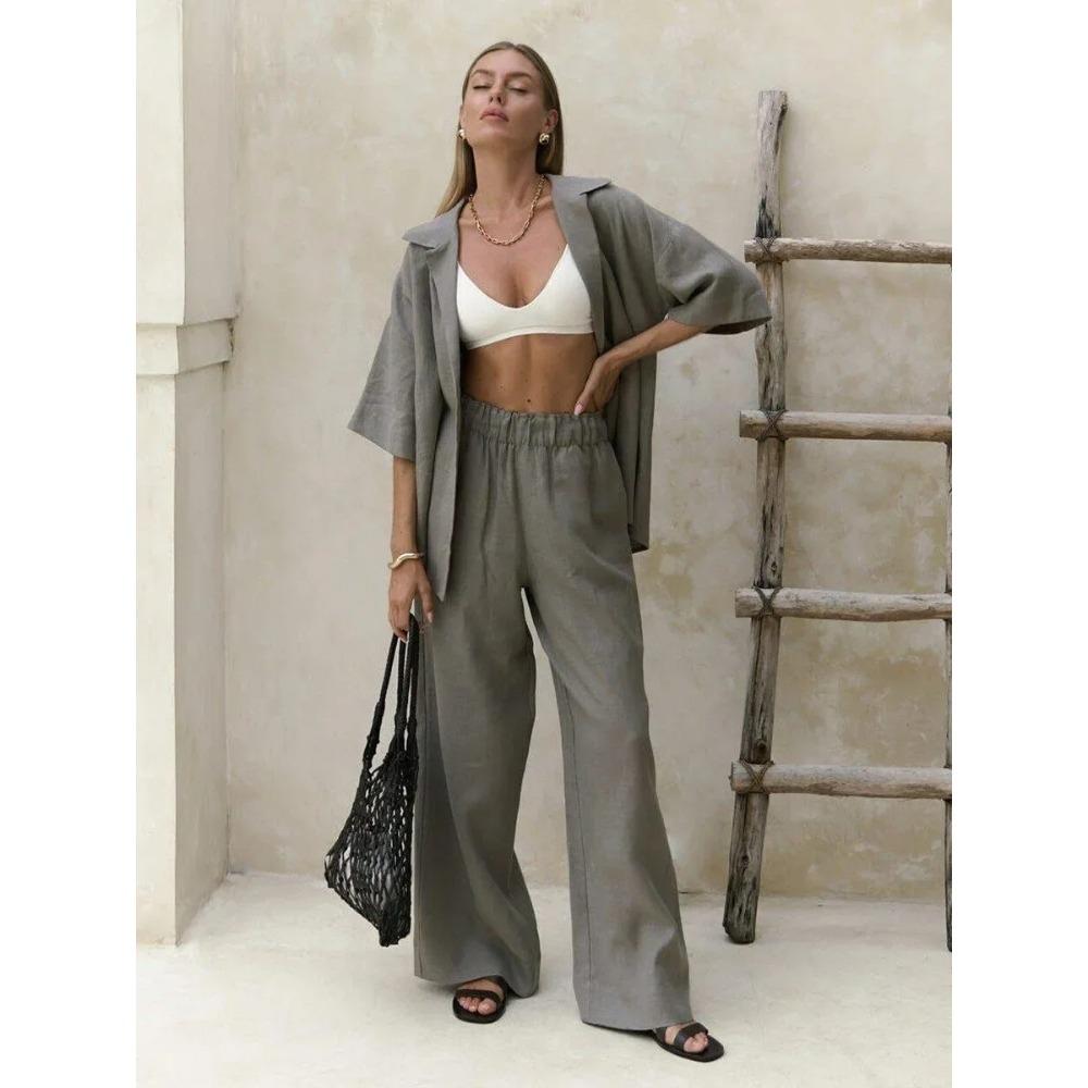 100% Baumwolle Kurzarmhose 2-teiliges Set Damen Einfarbig Kurzarmshirt Lockere Hose Freizeitset