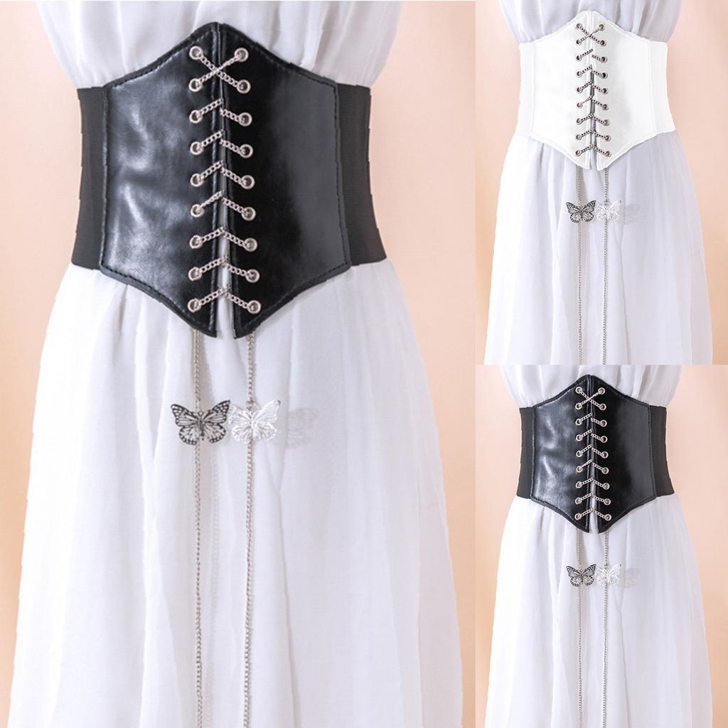 Slim Elastic Pu High Waist Belt Women Women's Girdle Style Chain Elastic Bow Knot Straps Black Punk Gothic Wide Belt Corsets
