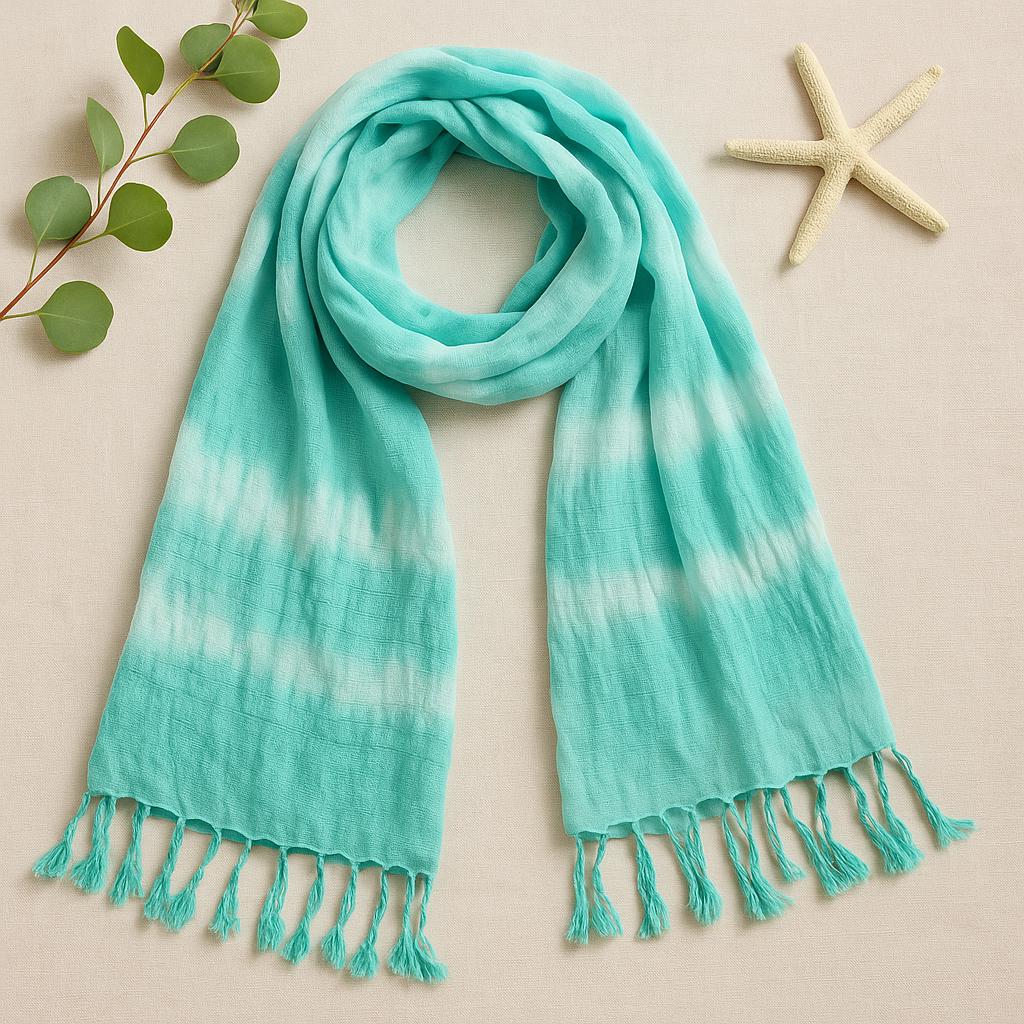 Boho Linen-Blend Turquoise Tie-Dye Long Tassel Scarf