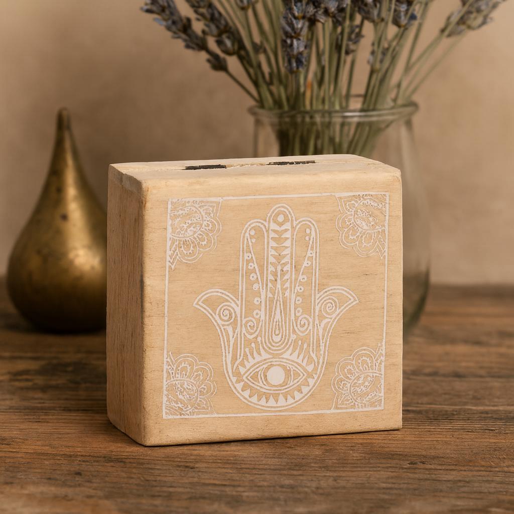 The light, natural wood has a smooth, matte touch and softly rounded edges. On the front face, a white Hamsa hand with a central eye is drawn in fine dots and lines, framed by four delicate floral mandala corners. The lid features two slim rectangular cut-outs that lend a gentle rhythm to the form. Crafted in India, it holds rings, daily jewelry, keepsakes, or small stationery with quiet ease. A thoughtful gift for a new home or a mindful workspace.