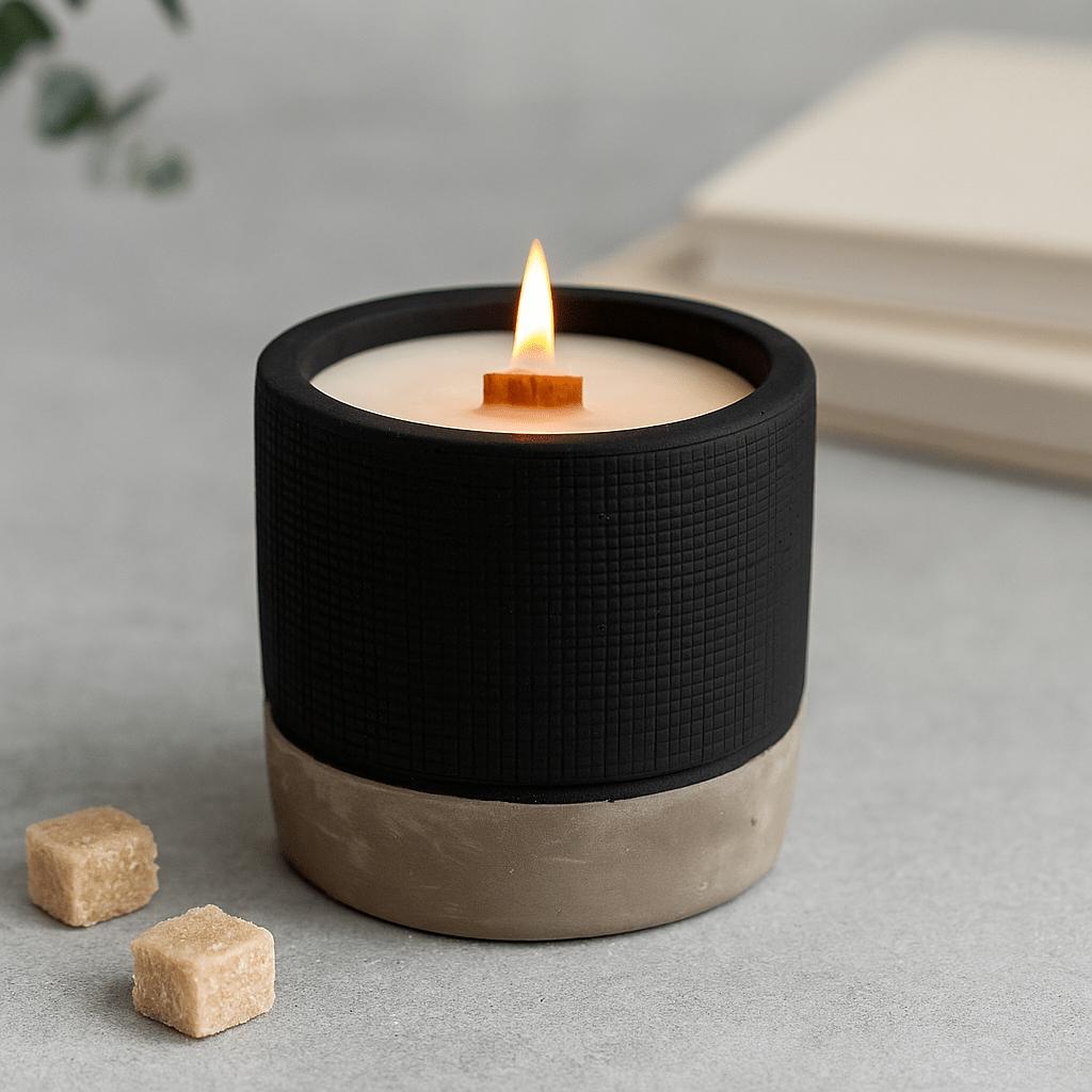 A quiet flame rises from the flat wooden wick, its soft crackle meeting a warm, creamy sweetness in the air. Set in a tactile, matte concrete vessel—textured charcoal above, smooth grey below—this candle brings together light and scent to settle the room and invite presence. 🕯️