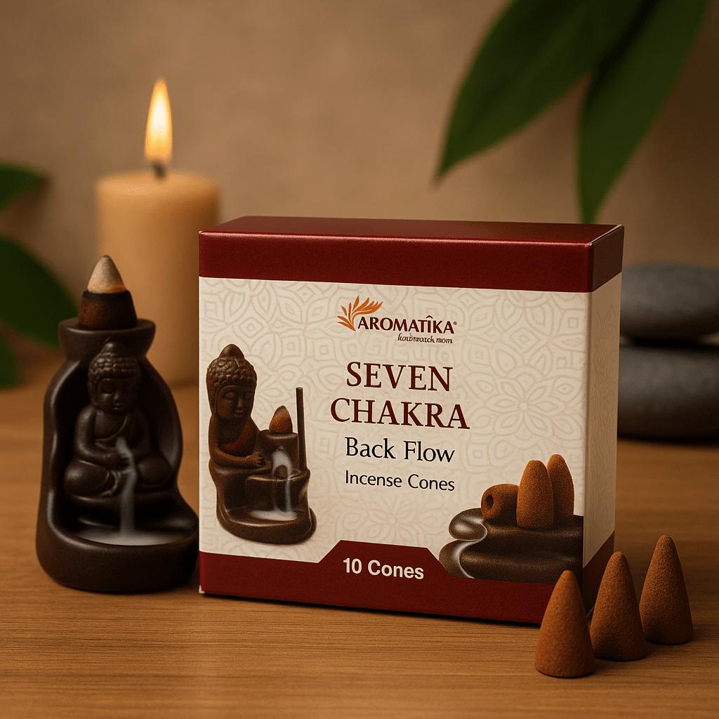 Crafted in India by Aromatika, where incense-making is a longtime art. This Seven Chakra edition nods respectfully to a classical map of seven centers often used for contemplation—offered here as a simple focus for mindful moments. Made with natural herbs, oils, and resins; presented in a clean maroon-and-white box with a subtle geometric motif. Each box holds 10 cones. 🪔