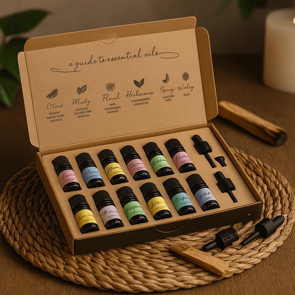 Lift the kraft-brown lid and meet a quiet apothecary of scent: twelve amber bottles, color-coded and neatly held in place. This curated collection arcs from citrus-bright to woodsy-calm, offering a grounded journey through scent for balance, focus, and gentle uplift in one box. 🌿