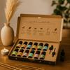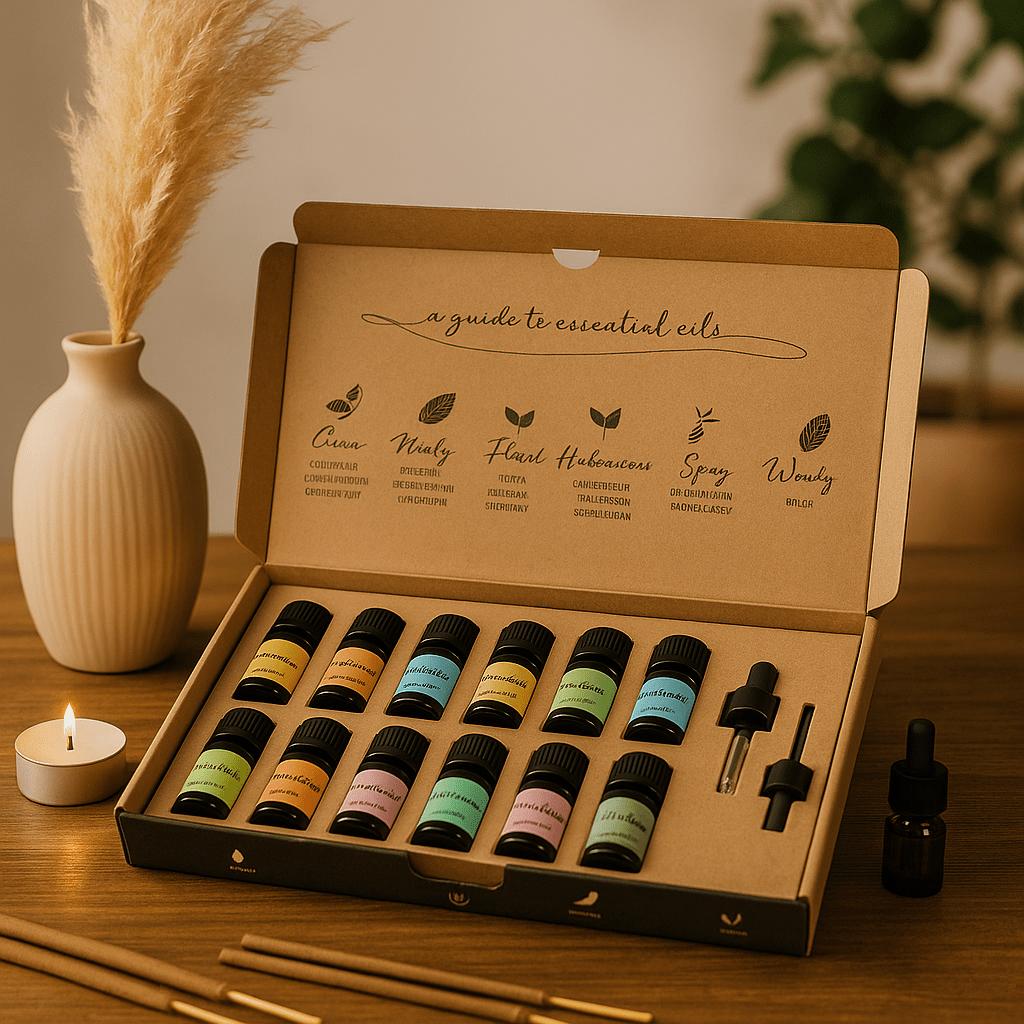 Heben Sie den kraftbraunen Deckel an und finden Sie zwölf bernsteinfarbene Flaschen, die ordentlich in einer weichen Einlage aufbewahrt werden, jede mit einem dezenten Farbetikett, das die Auswahl erleichtert.. Ein einfacher Führer, der innen auf den Deckel gedruckt ist, lädt dazu ein, nach Stimmung zu wählen – leuchtende Zitrusfrüchte, beruhigende Kräuter, erdende Hölzer oder klare Minze – so wird eine Schachtel zu einer sanften Reise durch den Duft.
