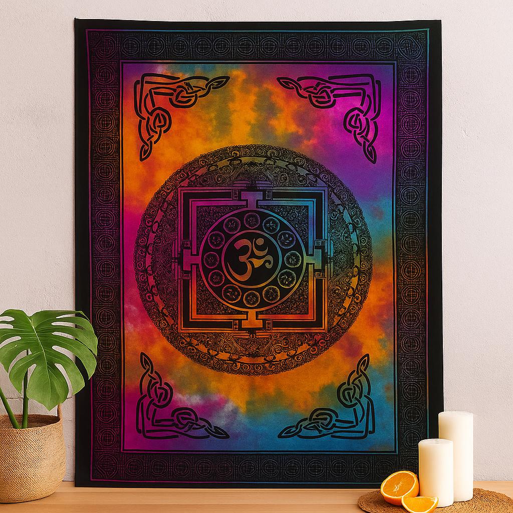 The high-contrast print—inky black over vivid tie-dye—draws the eye without overpowering the room. The cotton hangs with a soft drape and a smooth hand, lending warmth and a grounded feel to walls. At 78 × 112 cm, it works beautifully as a focal point above a desk, sofa, or altar, creating harmony through color and proportion.
