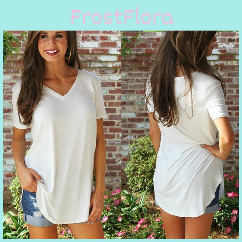 Stylish Women's Short Sleeve V-neck Hem Loose Casual Tee T-shirt For Summer Days