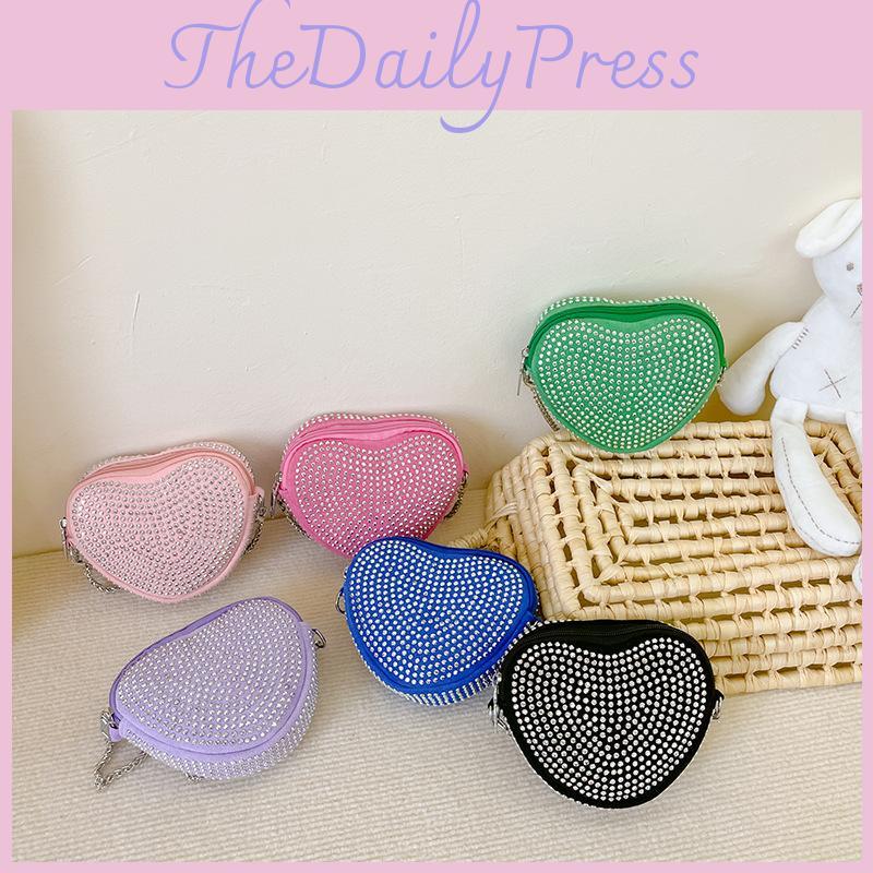 Korean Style Heart Shaped Rhinestone Mini Crossbody Bag For Kids With Trendy Design And Convenient Zipper Closure
