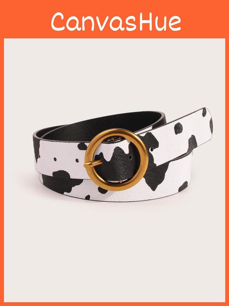 This fashion belt features a vintage cow print pattern made from durable faux leather, The alloy buckle with a pin closure enhances its stability and style, showcasing a modern animal motif. Ideal for casual outfits and denim looks. Wipe clean with a damp cloth to maintain its finish.