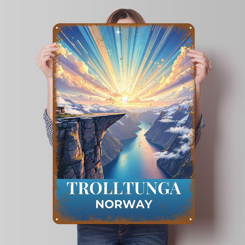 Gelassenes Trolltunga Norwegen Sonnenaufgang Metallschilder Transportposter Wohnzimmerdekorationen Heimdekoartikel Gartendekoration