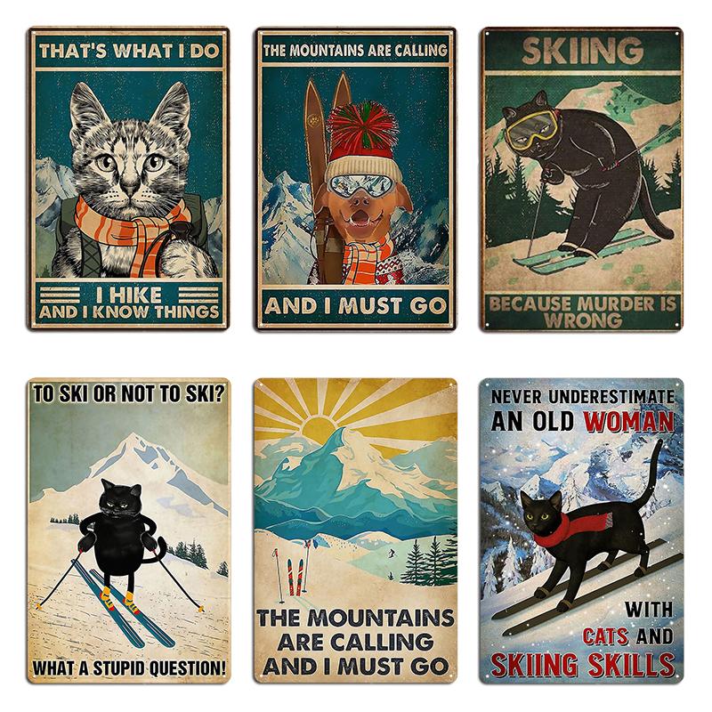 Black Cat Sky Because Murder Is Wrong Skiing The meowtains are calling and i must go Cat Metal Plaque Mural Tin Sign Poster