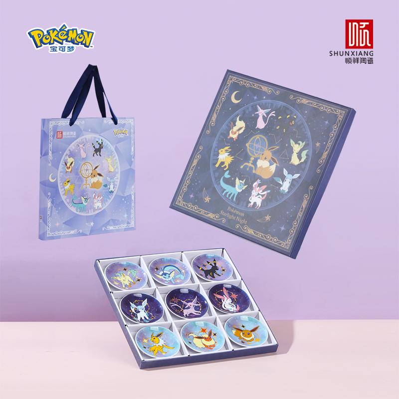 SHUNXIANG Pokémon Lizenzierte Evoli Serie 9-teiliges Keramik Geschirr Set Sternenhimmel Anime Themen Geschenkbox Saucenschälchen Teller Geschirr Geschenk