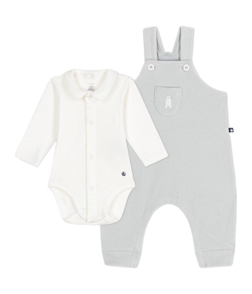 This two-piece baby set includes a clean, pure white round-collar body and a convenient pair of overalls. Crafted from environmentally friendly, smooth velour material for a comfortable fit, this unisex set makes a wonderful gift for a new baby or for everyday use. Note: Dark colors may fade or transfer color when rubbed or washed. Wash separately with a mild detergent.