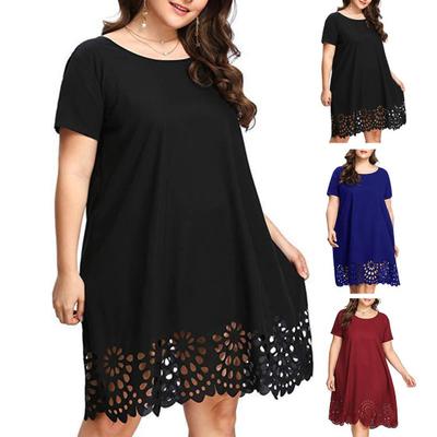 Frauen Sommer Midi Kleid Aushöhlen Saum Plus Größe Kurzen Ärmeln Rundhals Lose Saum Einfarbig Dame Täglichen Kleid