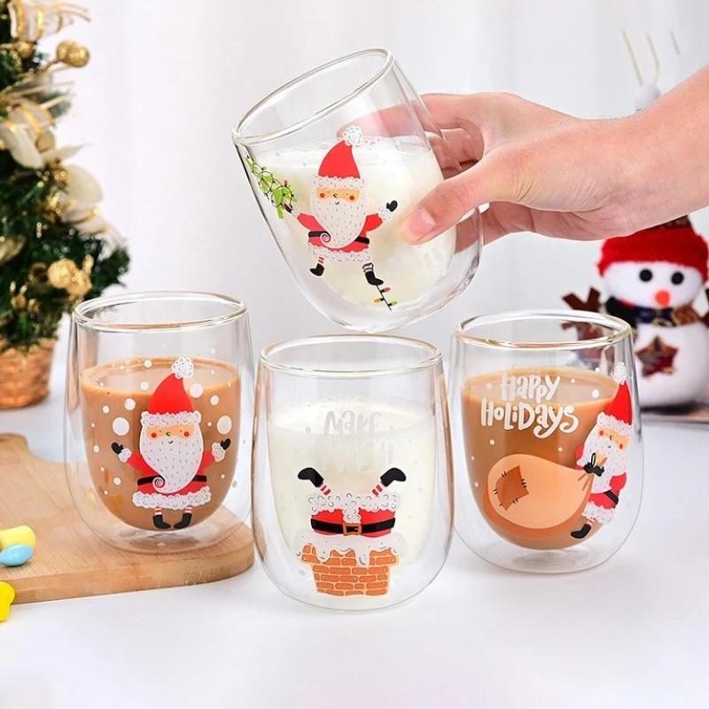 Weihnachtsglas Tasse Weihnachtsmann Muster Doppelwandige Kaffeetasse Frühstückswasserbecher für Kinder Zuhause/Büro Trinkgeschirr Weihnachtsgeschenke