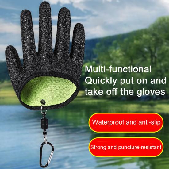 The high-quality latex anti-slip coating on the surface, with an irregular wrinkle texture, enhances the anti-slip effect, ensuring a secure grip when catching fish or removing hooks. Made of high-density latex and protective coating, these gloves are waterproof, anti-slip, anti-surge, and wear-resistant.