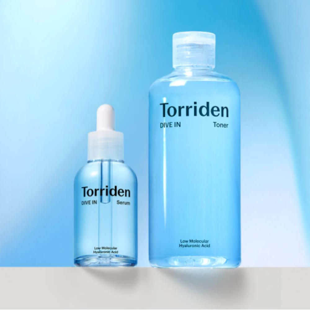 Torriden Hyaluronsäure-Serum, Dive-In Toner 300 ml, feuchtigkeitsspendendes Hautpflege-Set, niedermolekulare Hyaluronsäure, feuchtigkeitsspendendes Serum und Toner, koreanische Feuchtigkeitspflege-Routine, Torriden Feuchtigkeits-Duo 50 ml + 300 ml
