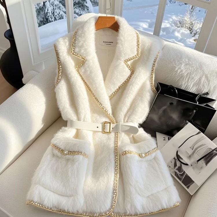 Winter Verdickt Pelzhaar Blazer Weste Jacke Goldene Seidenkante Damen Elegant Weiß Ärmellos Mantel Formell Dame
