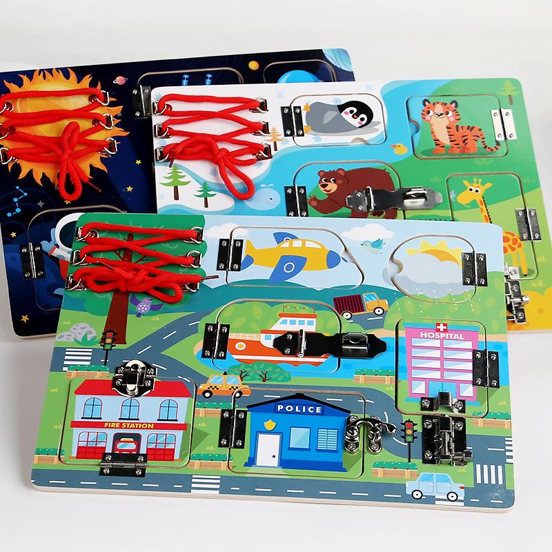 Baby Multifunktionales Holz-Beschäftigungsbrett Entriegeln und Einfädeln von Seilen Hand-Auge-Koordination Lebenskompetenztraining Lernspielzeug