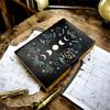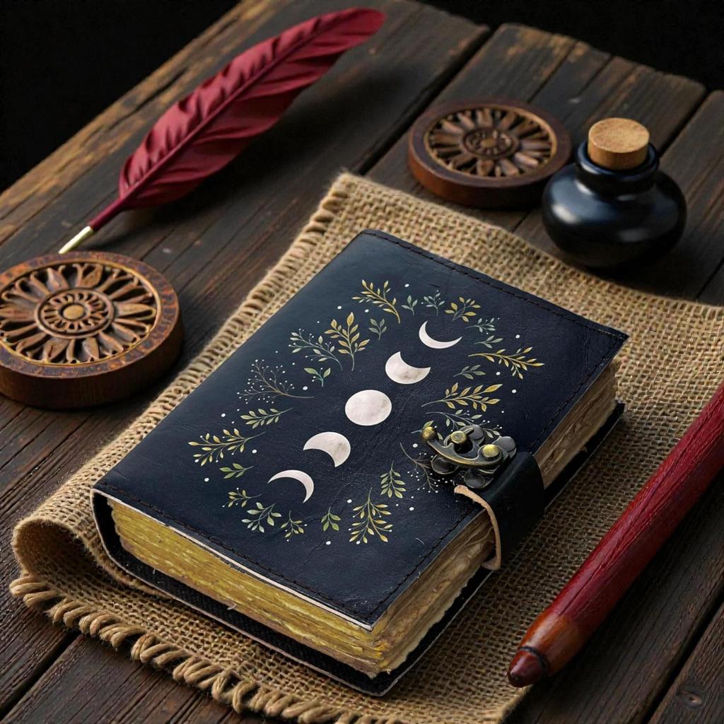 Moon Phase Leather Journal 5×7” | Handmade Deckle Edge Paper Diary 200 Pages | Black Mystic Notebook | Wiccan Moon Phases Journal with Lock