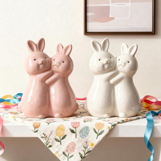 Dieses Kaninchenornament zeigt ein charmantes umarmendes Kaninchendesign, erhältlich in Weiß und Rosa, und symbolisiert Wärme, Freundschaft und Glück.. Gefertigt aus hochwertiger Keramik mit exquisiter Verarbeitung, bietet es eine zarte Haptik, während es umweltfreundlich und sicher ist..
