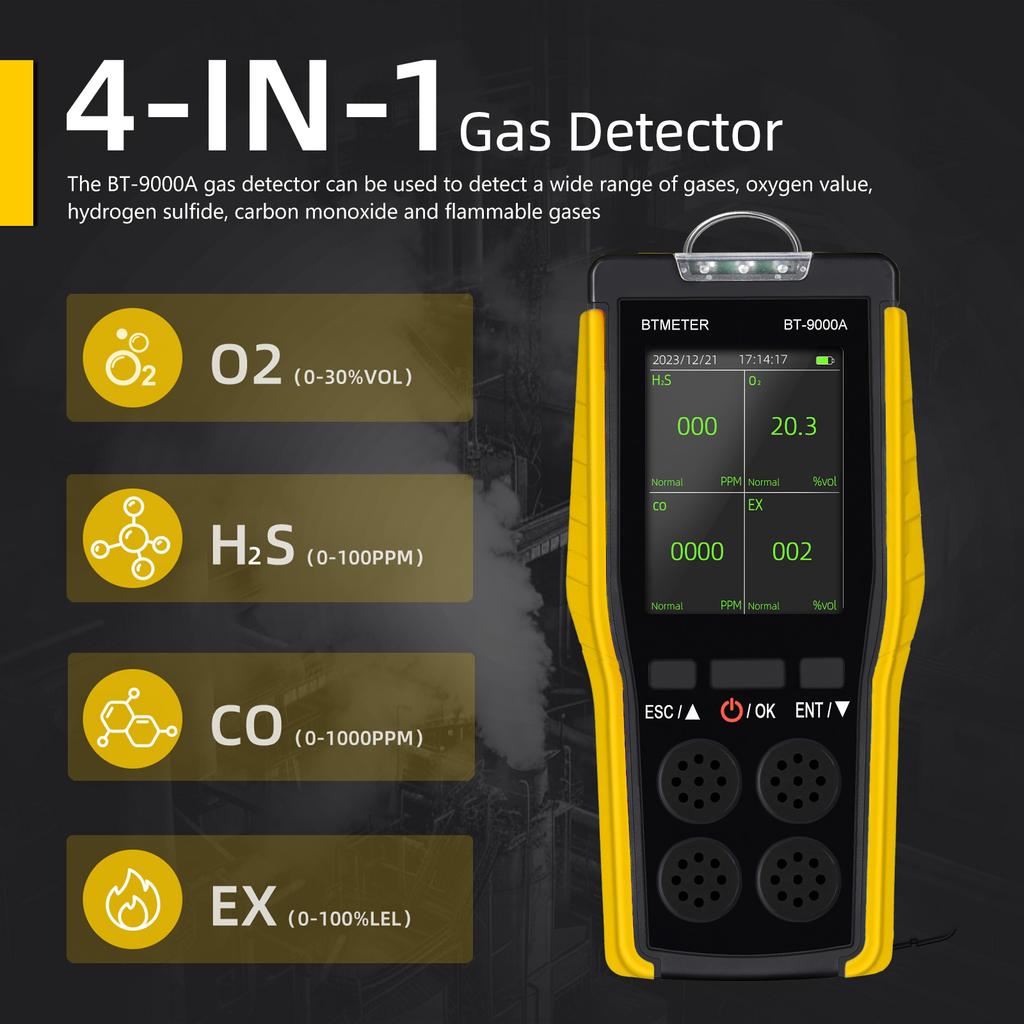 Measurement Range: O2: 0-30% VOL, H2S: 0-100 PPM, CO: 0-1000 PPM, EX: 0-100% LEL