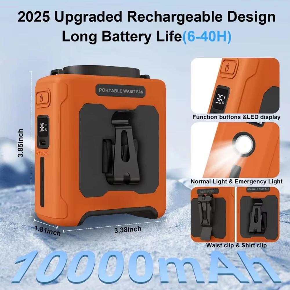 10000mAh Portable Outdoor Waist Fan Hanging Neck Strong Wind with Power Bank LED Lighting for Emergency Sports Outdoor Working
