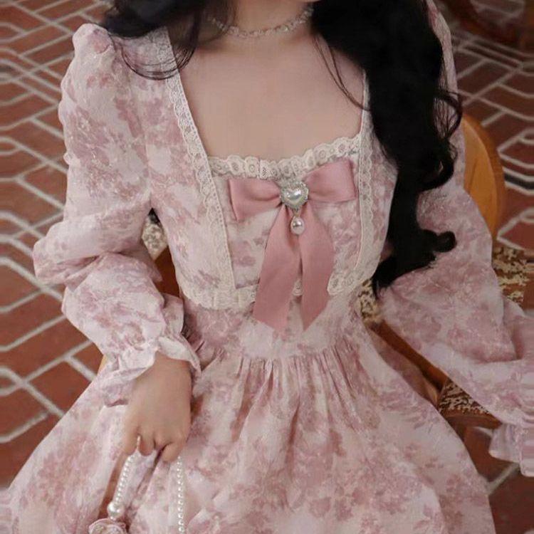 Sanftes Kleid im französischen Stil mit süßen langen Ärmeln für Damen, dehnbares Innenfutter, Ankunft im Herbst, Feensystem-Kleid