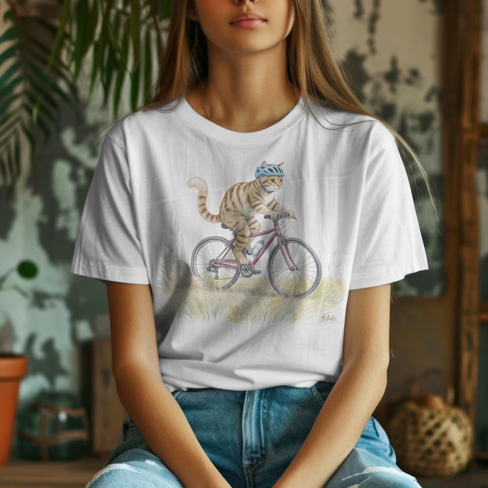 Lustige Katze fährt mit dem Fahrrad über ein Feld Unisex T-Shirt, Aquarell Katze fährt mit dem Fahrrad T-Shirt