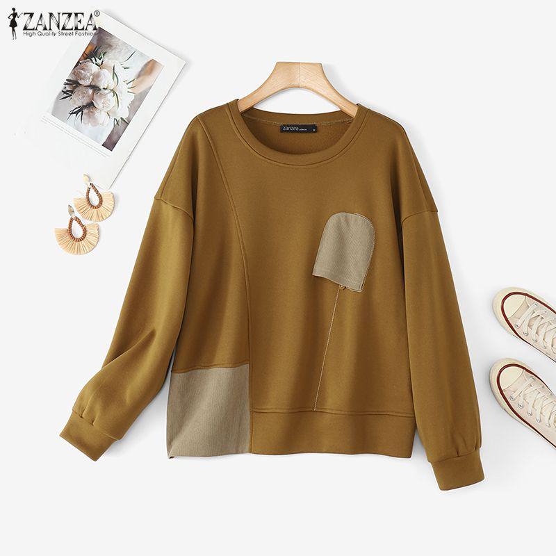 ZANZEA Women Casual Round Neck Long Sleeve Loose Splice Sweatshirts