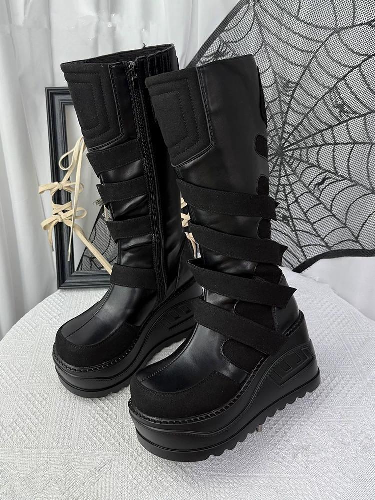 Schwarze Plateau Goth Stiefel für Damen Klobiger Absatz Schnürung Schnallenriemen Ideal für Punk/Rave Outfits Reißverschluss an der Seite Damen Trendige Mode