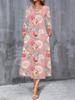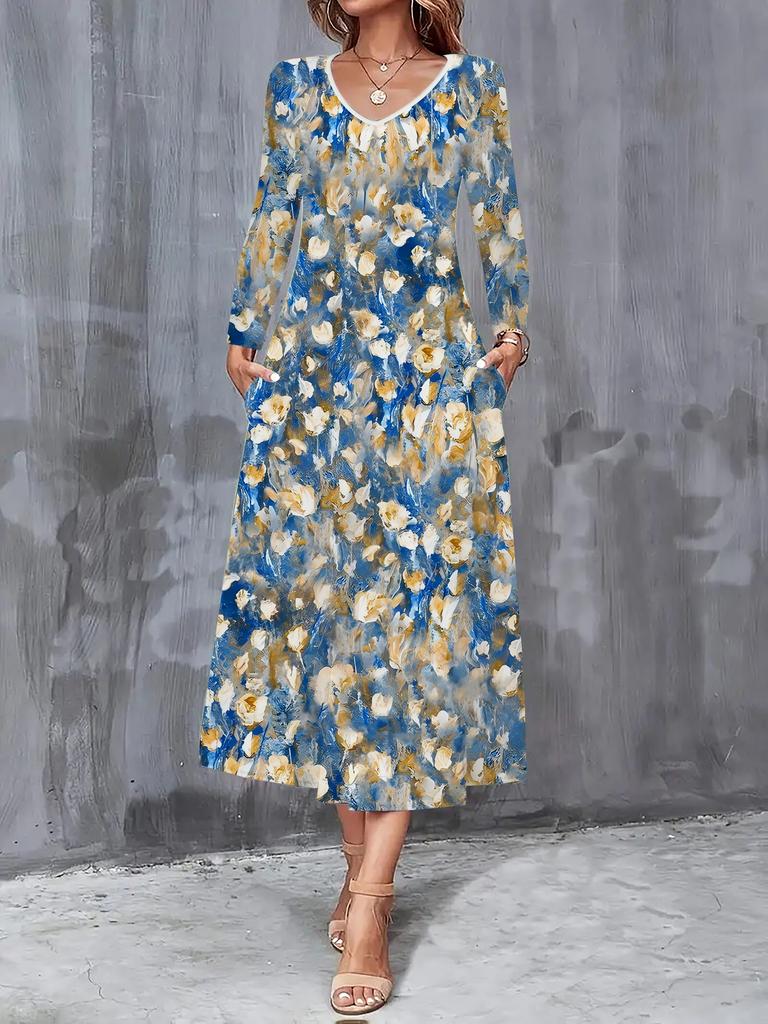 2025 Herbst und Winter Neue Damen Casual Mode Kleid Herbst 3D Blumenmuster Langarm V-Ausschnitt A-Linien Kleider