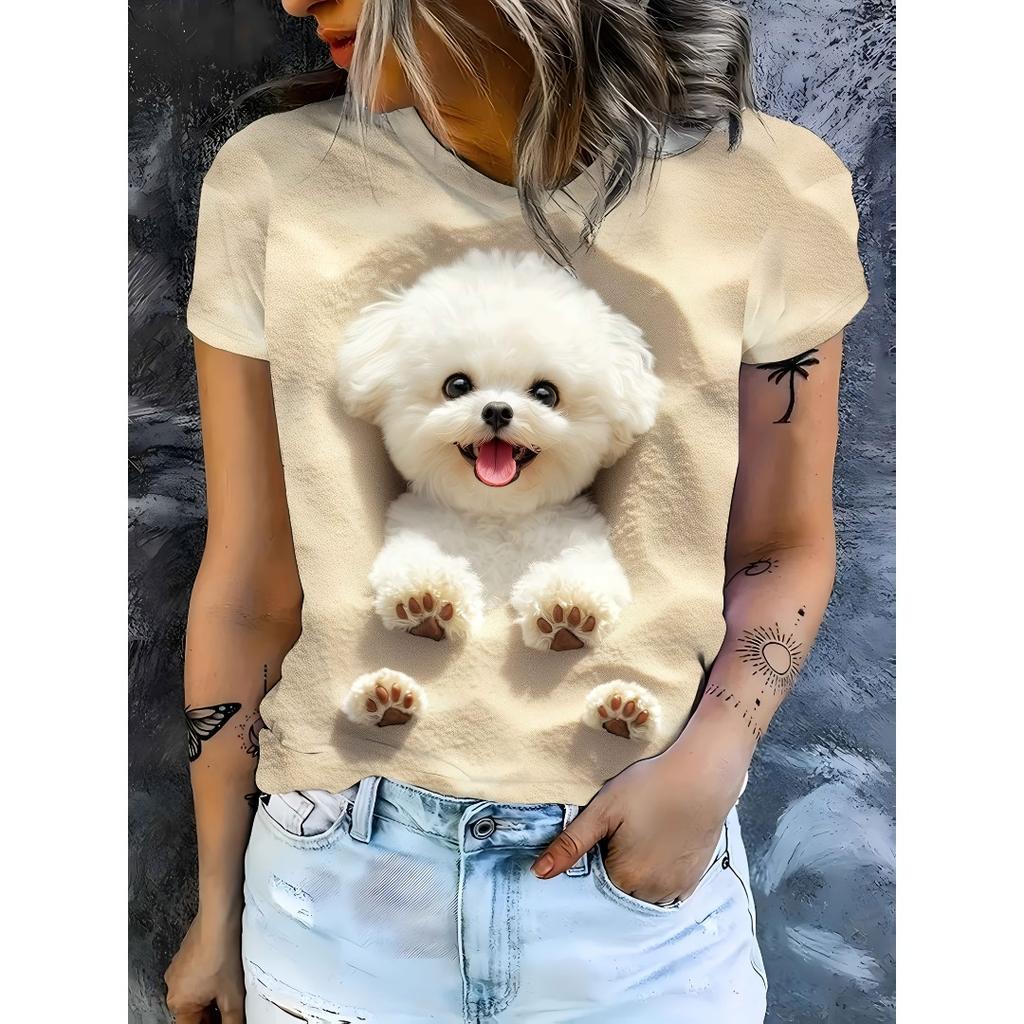 Damen Niedliches Plüsch Weißes Welpen 3D Grafik T-Shirt - Haustierliebhaber Oberteil mit beigem Hintergrund, Rundhals Lässig Täglich & Strand Look