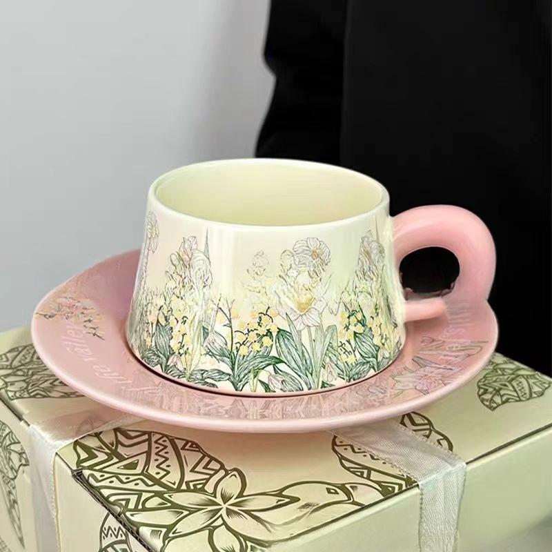 Kontrastfarben Ölmalerei Rosa Windspiel Blume Kaffeetasse Nachmittagstee Tasse Retro Keramiktassen- und Untertassenset Mädchen Souvenir Geschenk