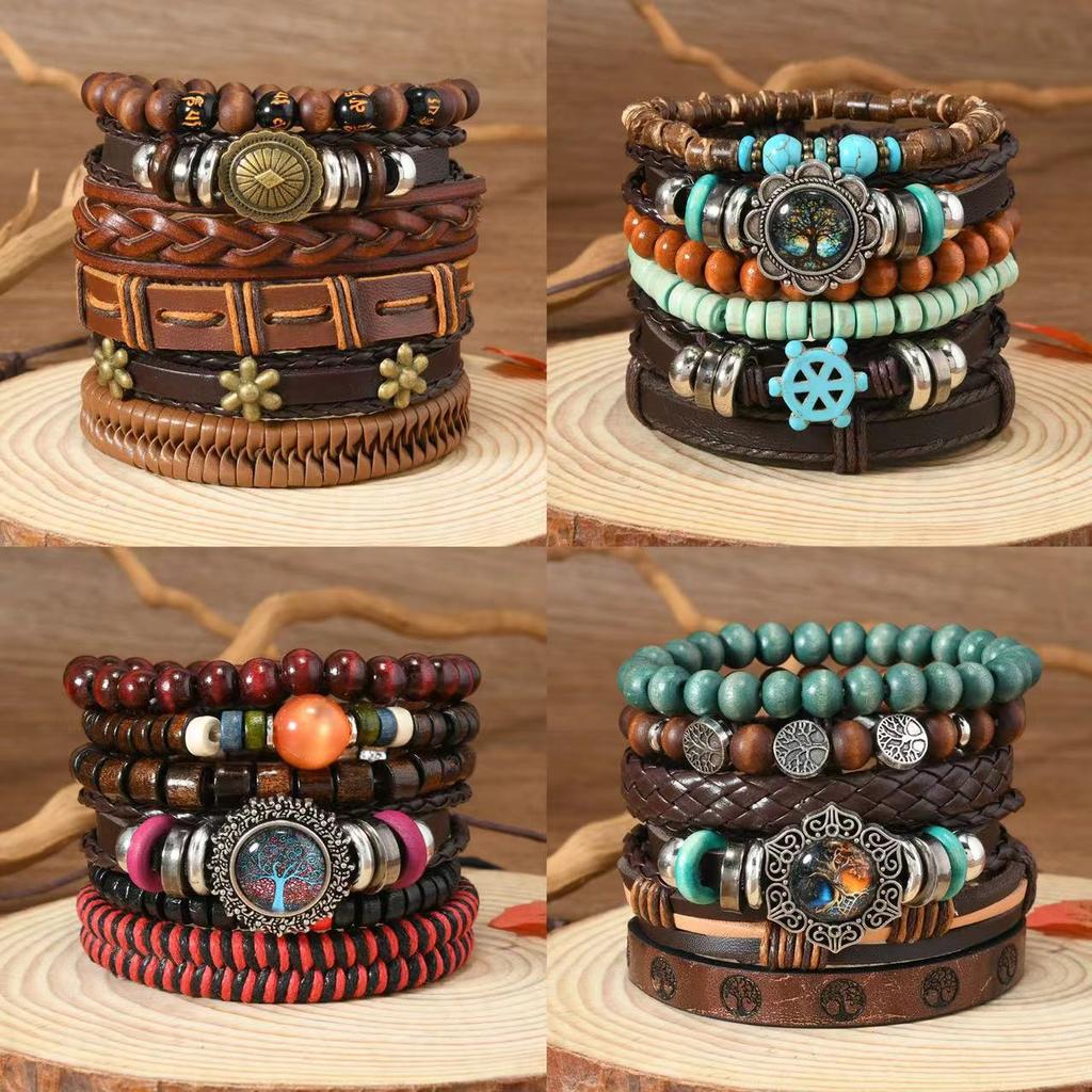 Leather Bracelets Set: Package contains classic leather braided bracelets, including black leather bracelets, wooden beads bracelets, hemp cords bracelets, life of tree pendent bracelets, and ethnic tribal bracelets.