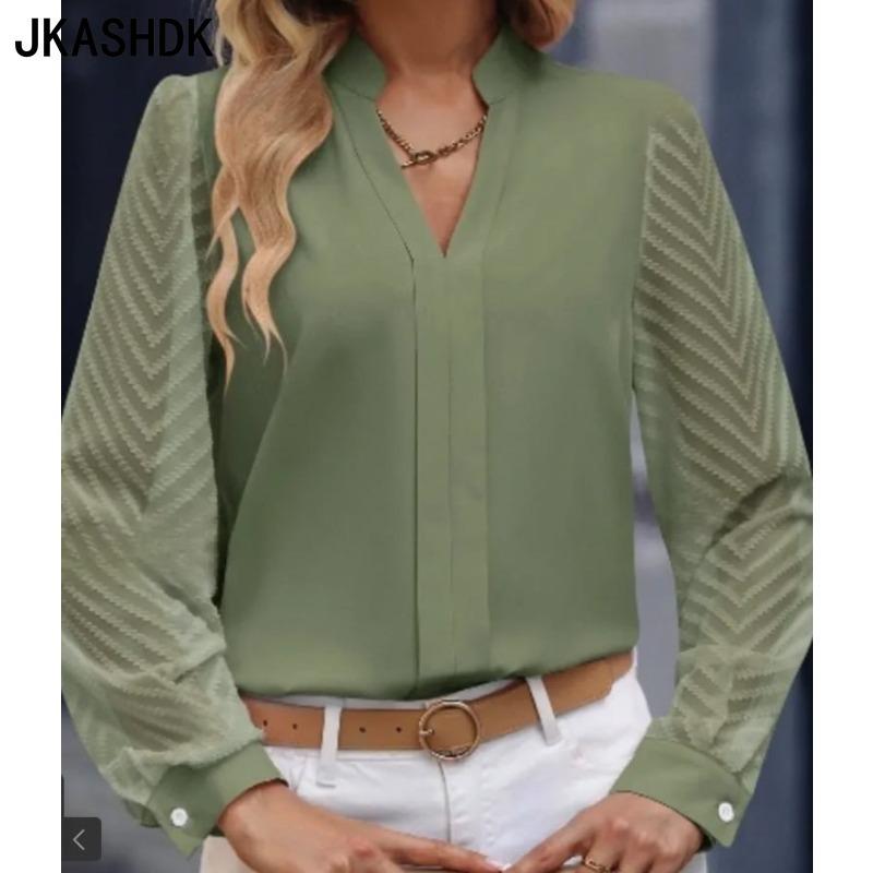 JKASHDK Damenmode, lässig, Frühling und Herbst, einfarbig, langärmelig, V-Ausschnitt, Blusen und Hemden