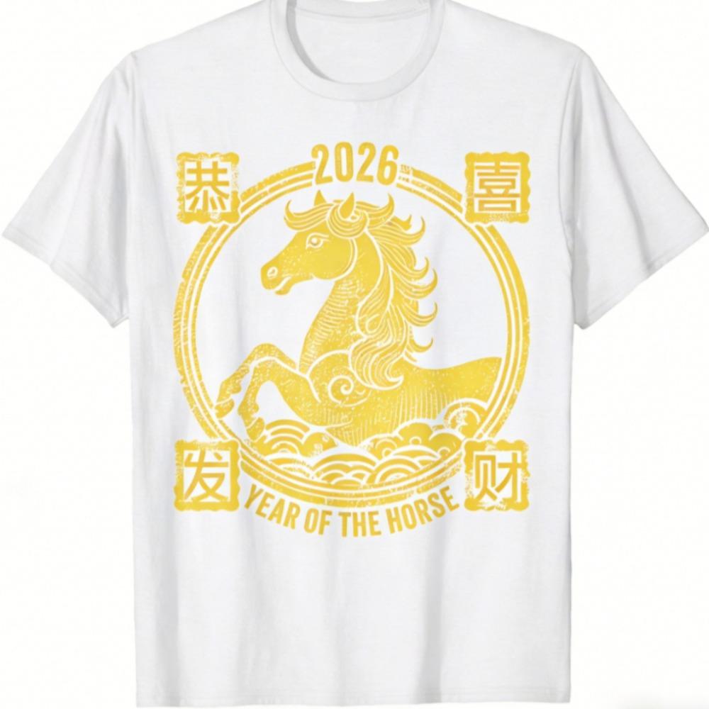 Vintage Pferd 2026 Frohes Neues Jahr T-Shirt Chinesisches Neujahr des Pferdes T-Shirt Damen Urlaubs-Shirt Mode Baumwoll-Tee