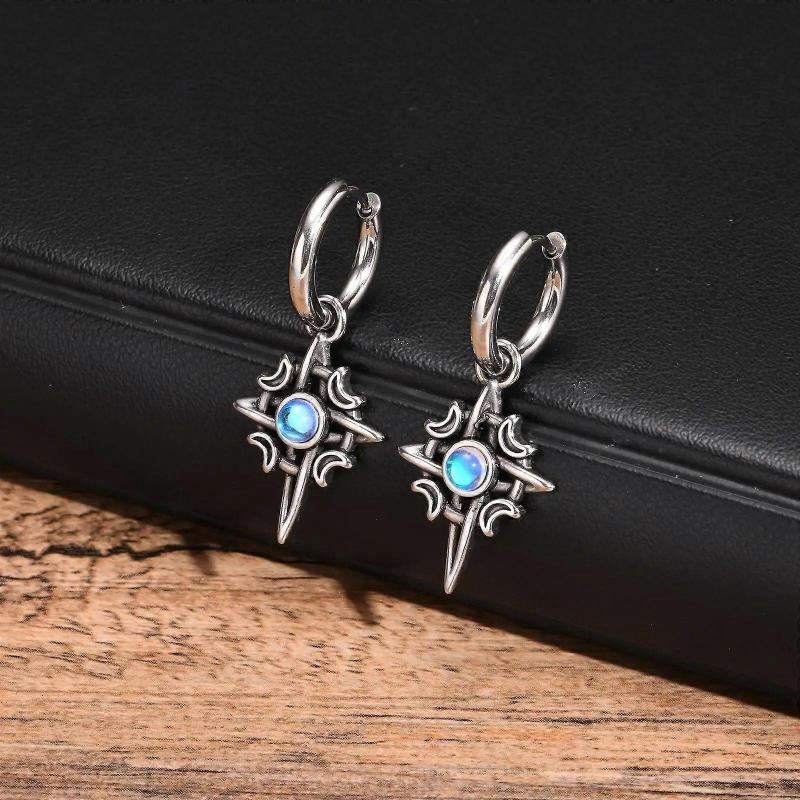Men's Stainless Steel Moonstone Star Hoop Earrings, Waterproof Hiphop Jewelry