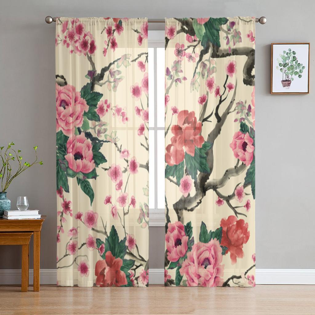 Sakura Pfingstrosenblüten in Vintage-Topf Transparente Gardinen für Wohnzimmer Durchsichtiger Tüll Fenstergardine Schlafzimmer Küche Schleier Vorhänge