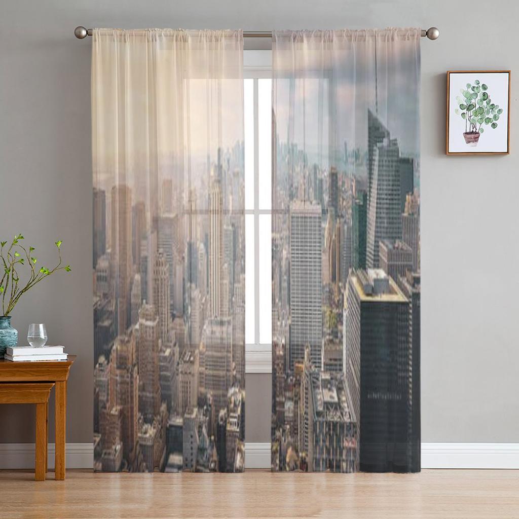 New York City Skyline Mit Blauem Bewölktem Himmel Und Sonnenstrahlen Transparente Vorhänge für Wohnzimmer Schlafzimmer Fenster Voiles Tüllvorhang