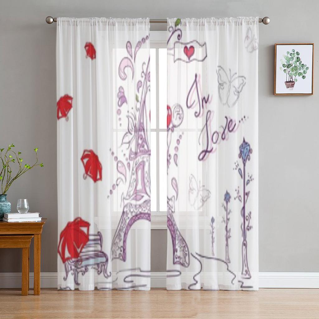 Herbst Romantisches Paris Roter Regenschirm Tüll Transparente Vorhänge für Wohnzimmer Schlafzimmer Küchendekoration Voile Organza Vorhänge