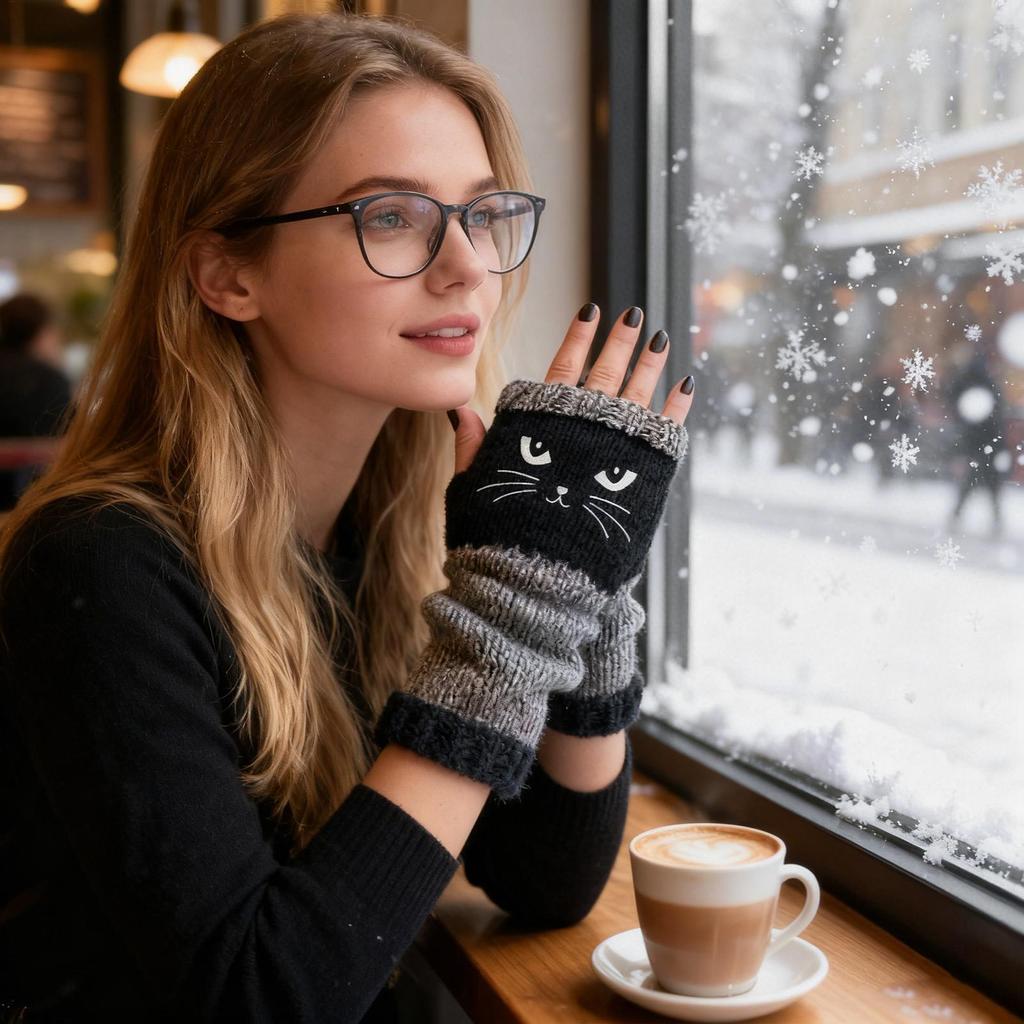 Winter Warme Handschuhe, Patchwork-Strickhandschuhe mit Katzenstickerei, Modische Fingerlose Freizeit-Damenhandschuhe, Neujahrsgeschenke