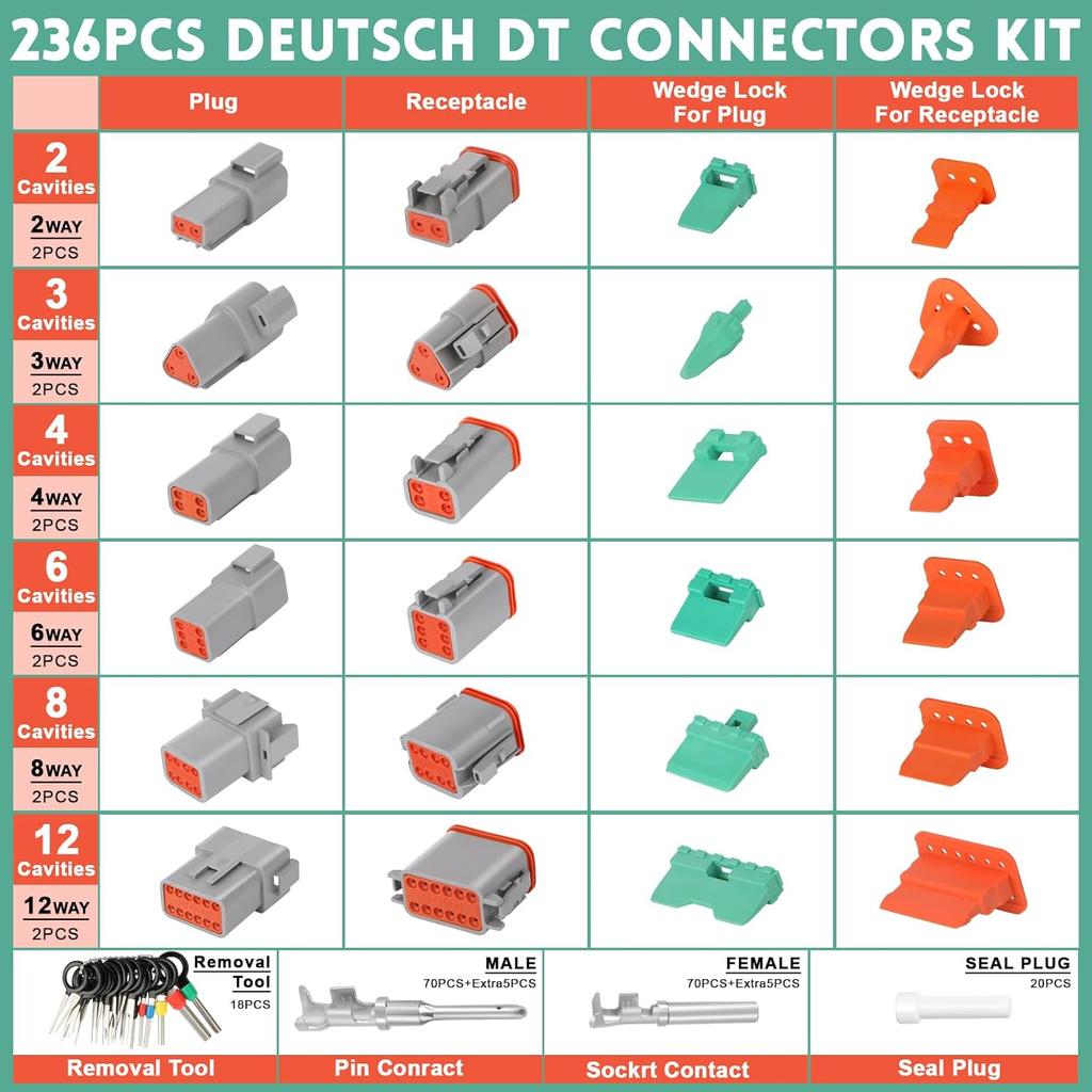 236PCS Deutsch Connector Kit with Crimper, 2-12 Pin Waterproof Automotive Connectors, Includes Removal Tool & 14-20AWG Contacts