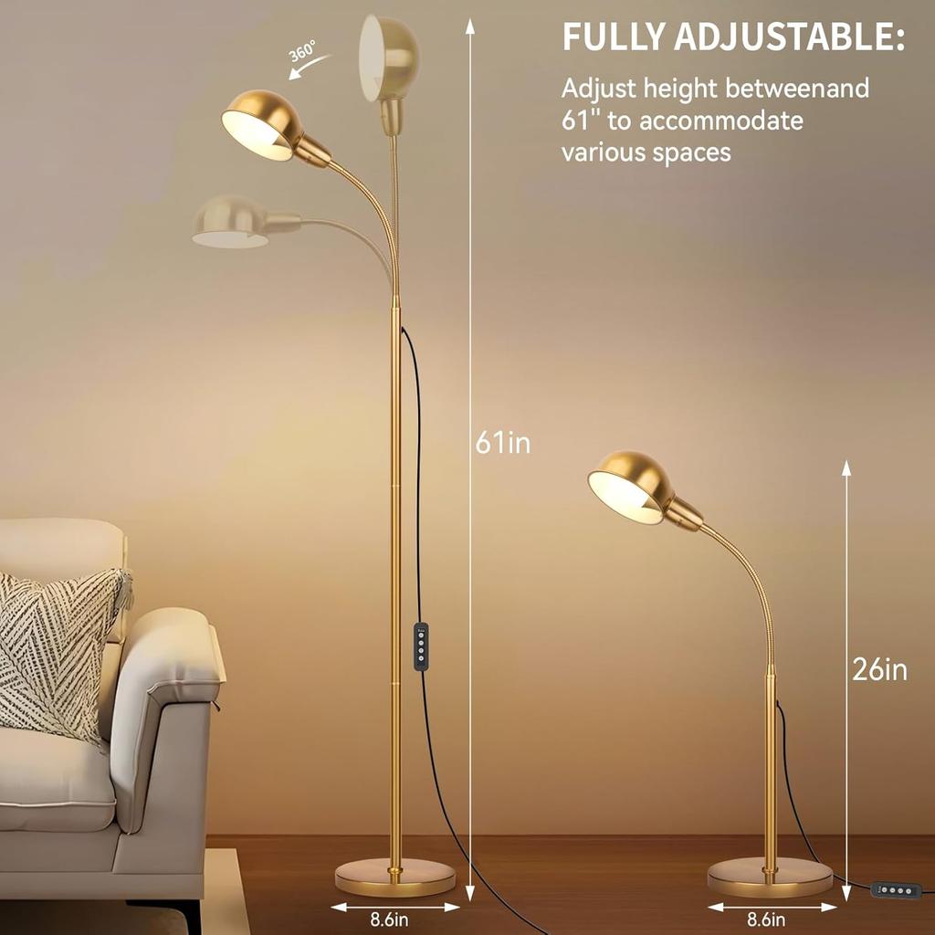 Goldene Stehleuchte mit Dimmer & Timer, Flexibler Schwanenhals, LED-Birne zum Lesen, Nachttisch, Wohnzimmer