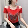 Sexy Damen Einheitslängen Neues Bügel-Diamant-T-Shirt Temperament Mesh-Shirt Raffinierter Schulterfreier Top Sommer