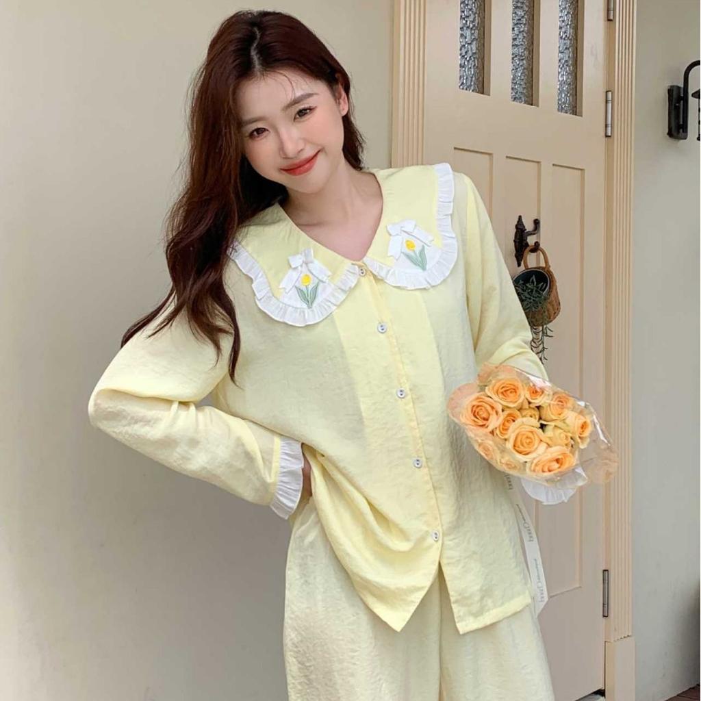 Neues Frühjahrs- und Sommer-Dünnes Satin-Stickerei-Langarm-Hauskleid Süßes Mädchen-Schlafanzug-Set