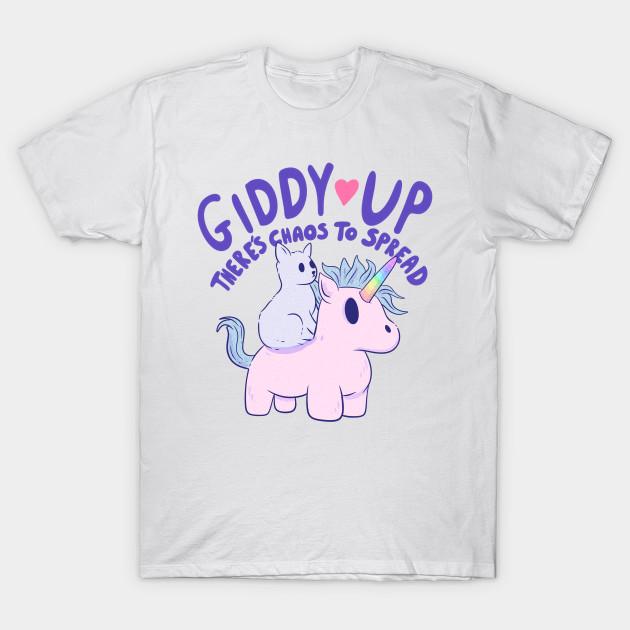Herren Schwarzes Print T-Shirt Niedliche Katze reitet Einhorn - Giddy Up, es gibt Chaos zu verbreiten Kein Schnitt Transferpapier Druck Baumwoll-T-Shirt