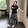 Koreanischer Retro Kleiner Blumenrock für Damen im Sommer Neu Seitenschlitz Elastischer Hoher Bund A-Linie Kuchen Langer Rock