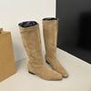 Vintage Stretch Slim Damen Kniehohe Stiefel Mode Slip On Spitzschuhe Herbst Winter Niedrige Absätze Ritter Lange Stiefel